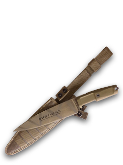 Cuchillo profesional de cocina en color Desert Camo y acero Böhler N690 (58HRC), con agarre en Forpreno®, apto para sistema M.O.L.L.E.
