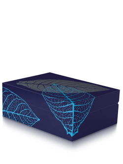 Humidor Zino de Davidoff de la colección Graphic Leaf con capacidad para 50-60 puros, decorado con hojas de tabaco en vibrantes colores.