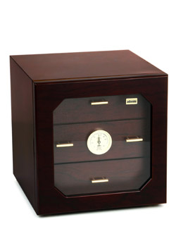 umidor con puerta de cristal, higrómetro y humidificador e interior en cedro español con 3 cajones, acabado en laqueado en palo de rosa.